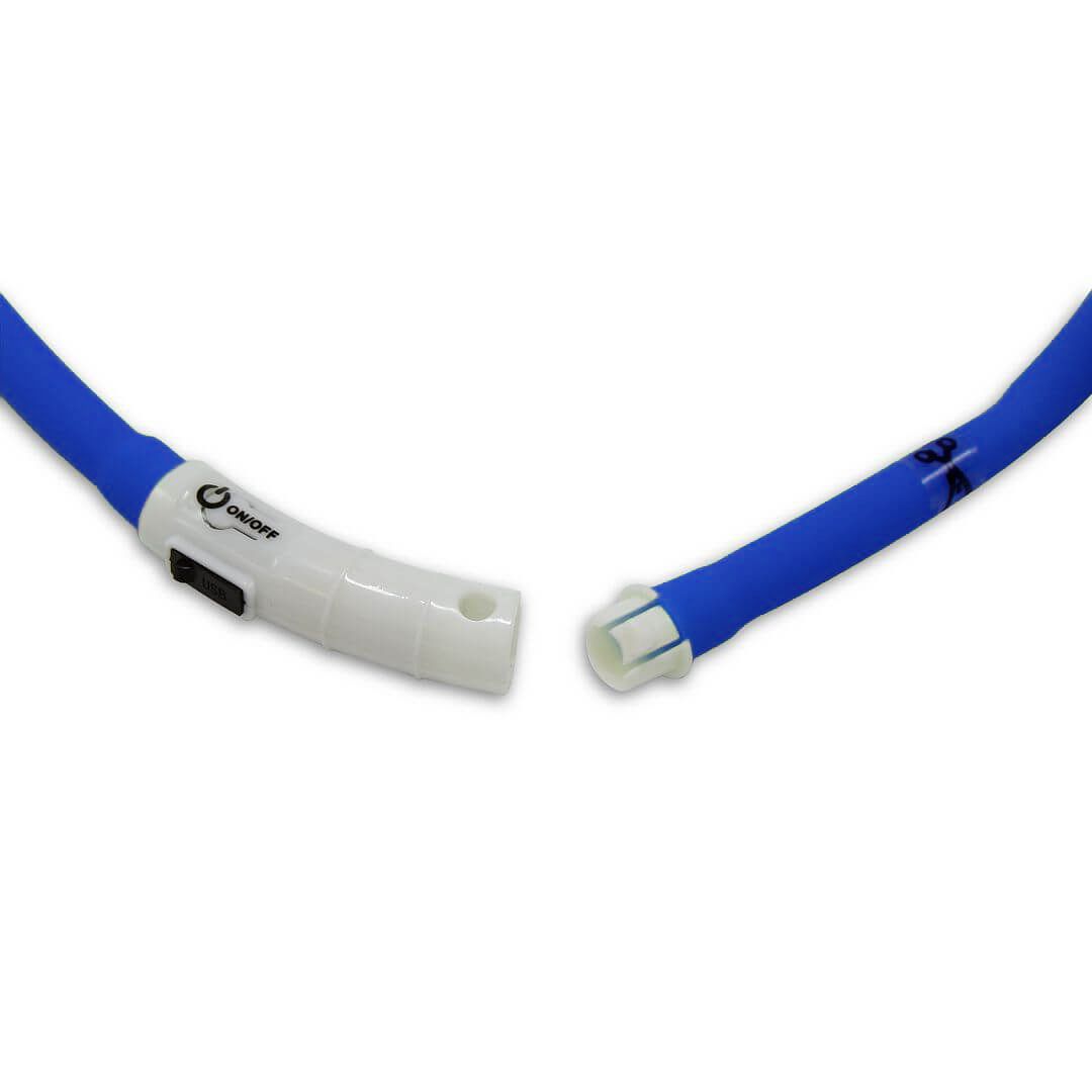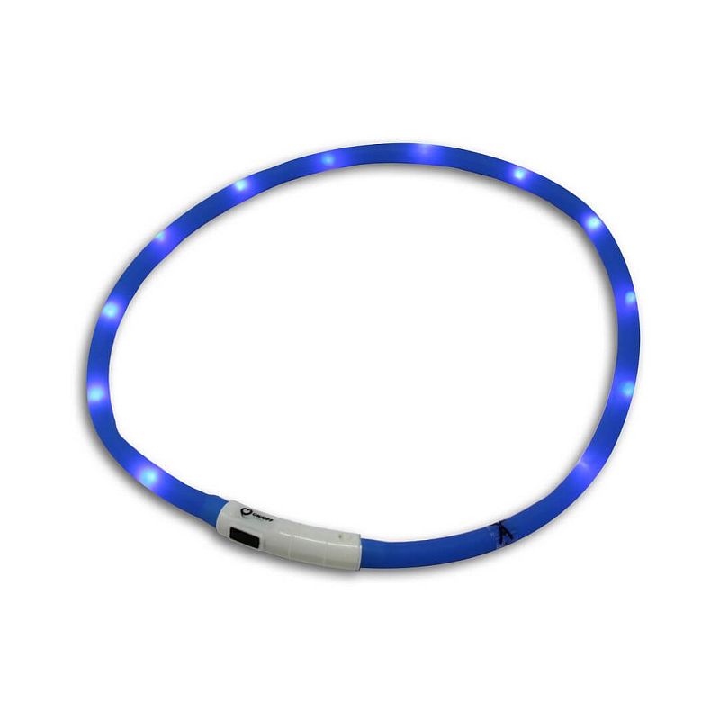 Silikonový svítící obojek pro psy v modré barvě dopřeje klidnější procházky při špatné viditenosti. Zvládne tři módy - pomalé a rychlé blikání a stálé svícení a jeho viditelnost je až na 500 metrů. Na jedno nabití přes USB svítí až 5 hodin. Nastavitelná délka ze základních 70 cm. Pro malé i velké chlupáčky.